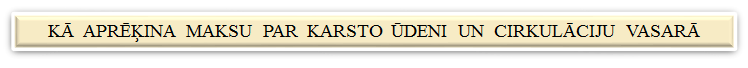 VASARAS SEZONĀ 1m3 aukstā ūdens uzsildīšanai nepieciešamais siltumenerģijas daudzums ir 0,047 MWh/m3 (pieņemot, ka aukstā ūdens temperatūra vasaras sezonā ir +15°C).